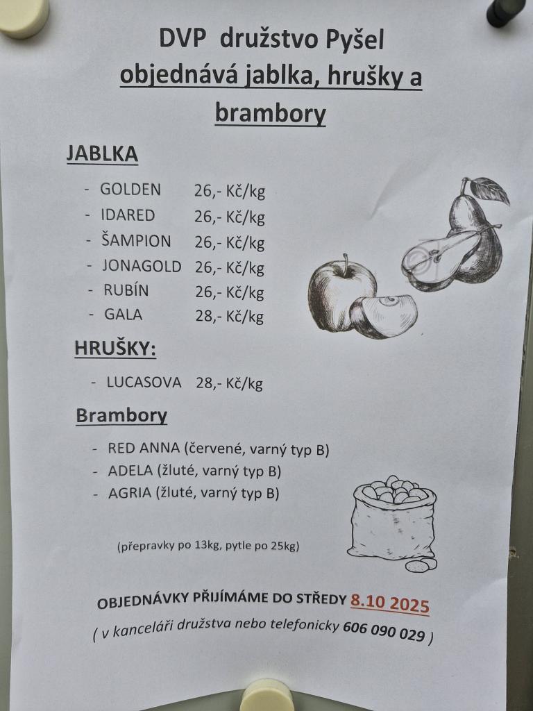 DVP Pyšel přijímá do 8.10.2025 objednávky na jablka, hrušky a brambory