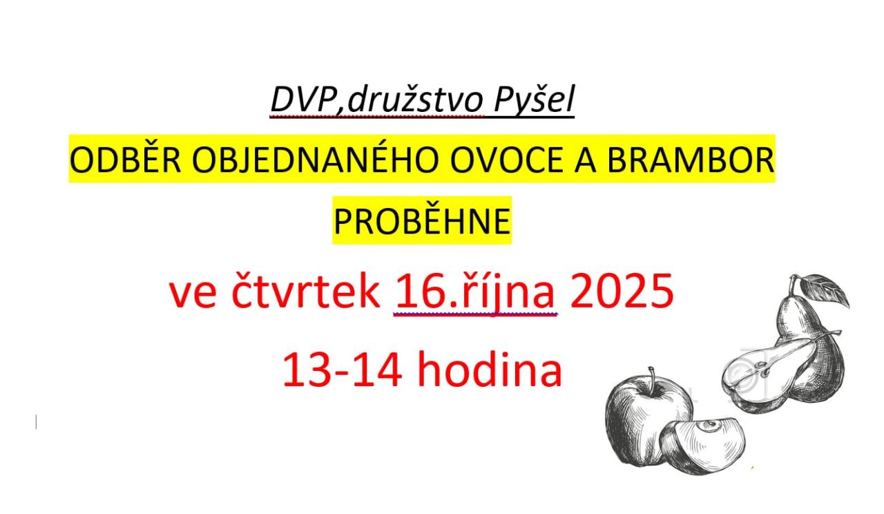 Ve čtvrtek 16.10.2025 si můžete vyzvednout v DVP Pyšel vaše objednávky. Zboží bude připraveno mezi 13 a 14 hodinou.