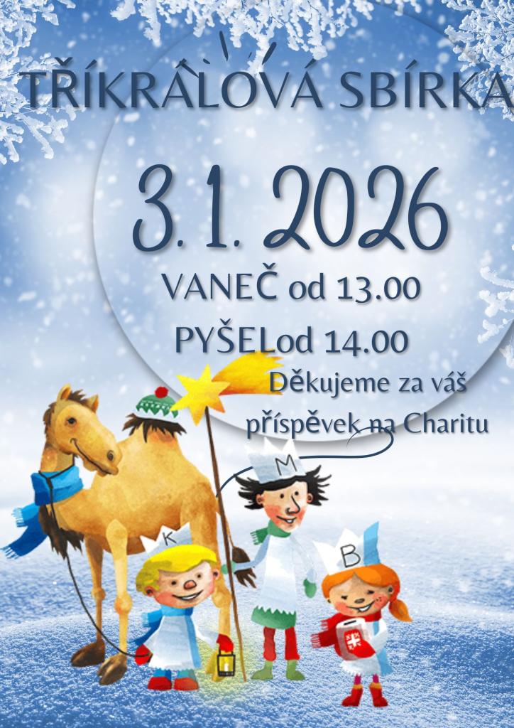 Tříkráloví kolednici vyrazí k našim domovům v sobotu 3.1.2026. Ve Vanči již od 13 hodiny v Pyšele od 14 hodiny. Prosíme otevřete jim dveře a přispějte těm, kdo to potřebují. Vaše dary poputují na Charitu ČR. Děkujeme