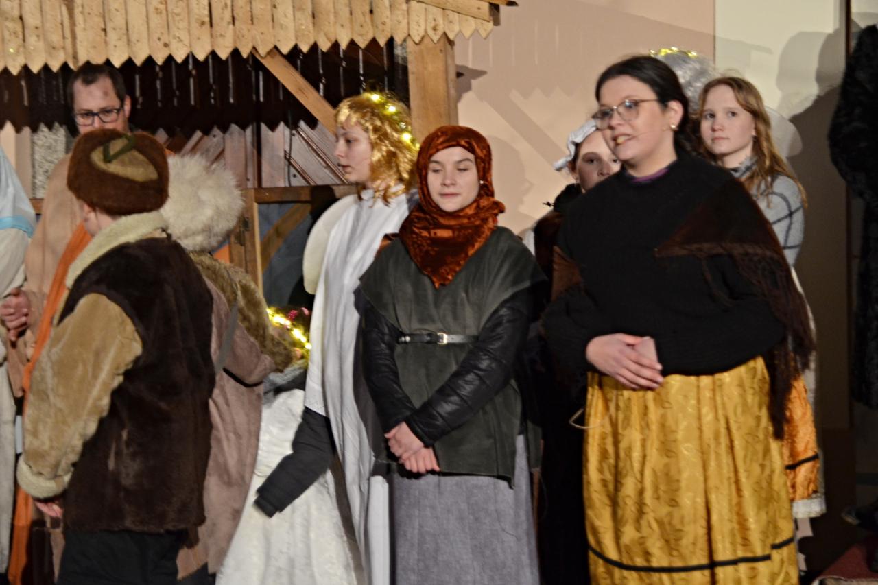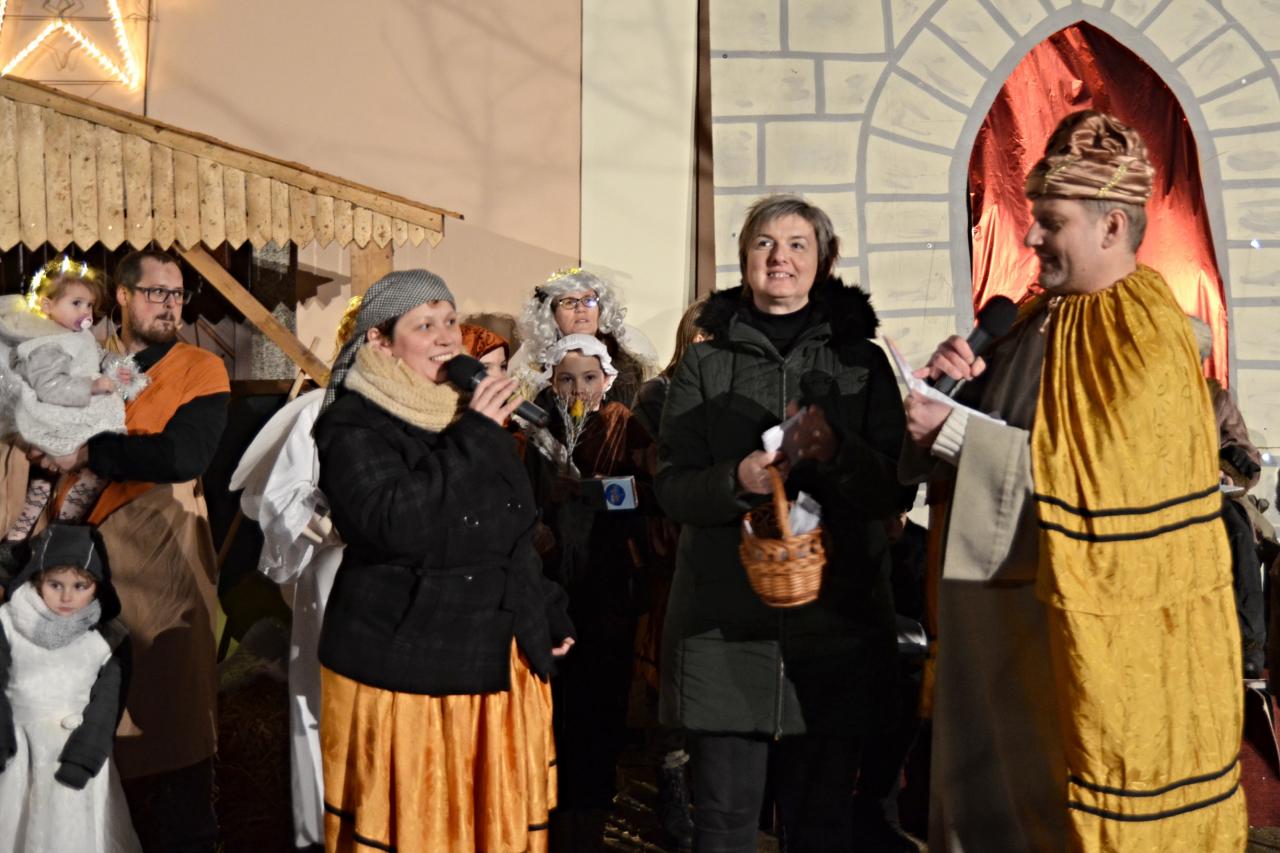 Fotografie z Živého Betléma 26. 12. 2022 u kostela sv. Barbory v Pyšele se slosováním soutěže Pyšel plný světýlek.