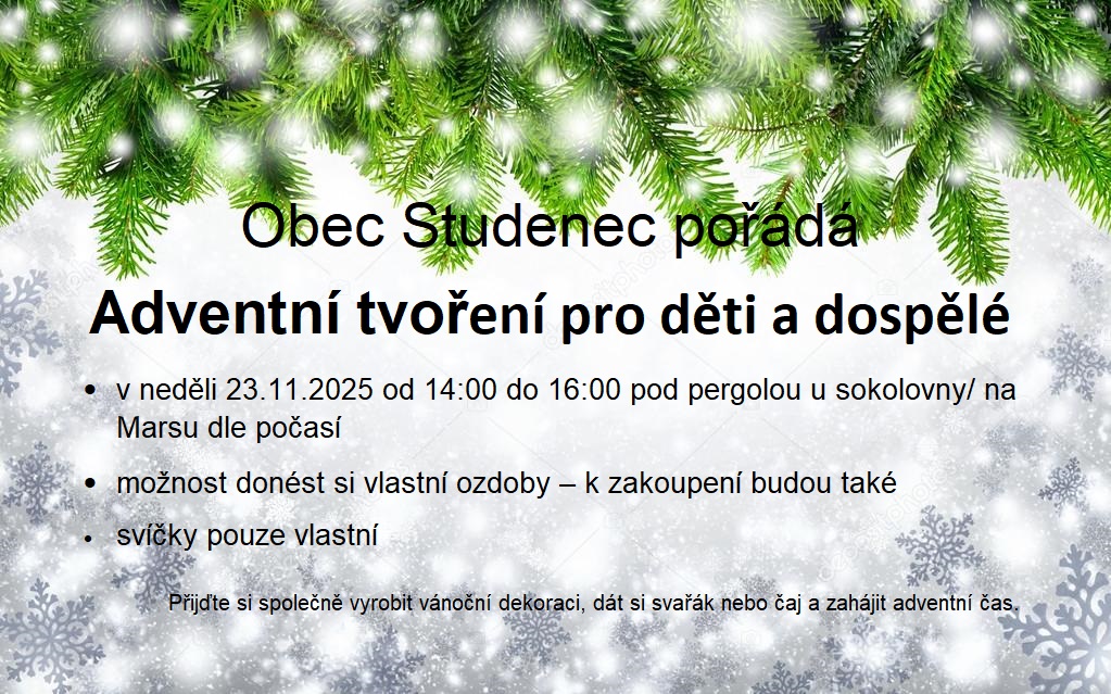 Obec Studenec pořádá v neděli 23.11. od 14:00 v areálu za sokolovnou adventní tvoření pro děti i dospělé. Více info na plakátu.